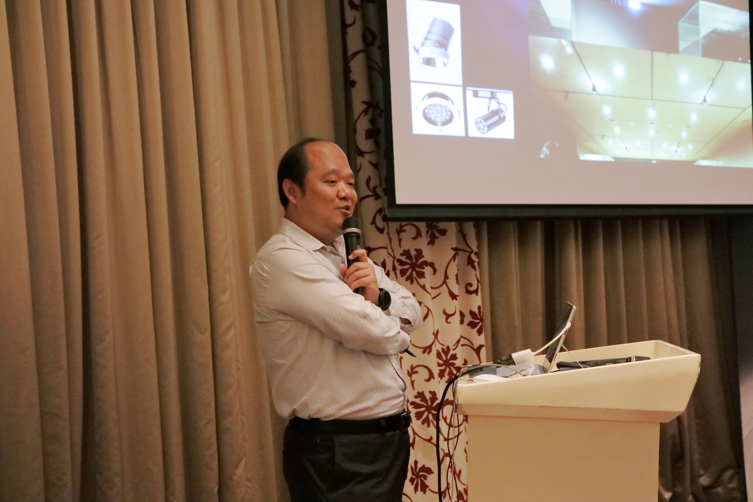 Geosheen极成光电设计部经理丁守国先生做了“空间环境光”的分享。他通过Geosheen极成光电的经典案例和经典产品两个方面,阐述了各项专业参数指标及光品质的概念,演示不同应用空间所适宜的参数指标及灯具类型,展示出对于光品质的追求。同时也介绍了Geosheen极成光电适用于酒店、会所、豪宅的优势产品,为设计师们的日常运用提供参考。