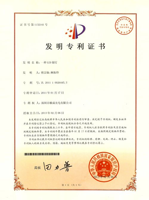 Geosheen极成光电一项LED射灯光学设计获发明专利(专利号:ZL201110026445.3)