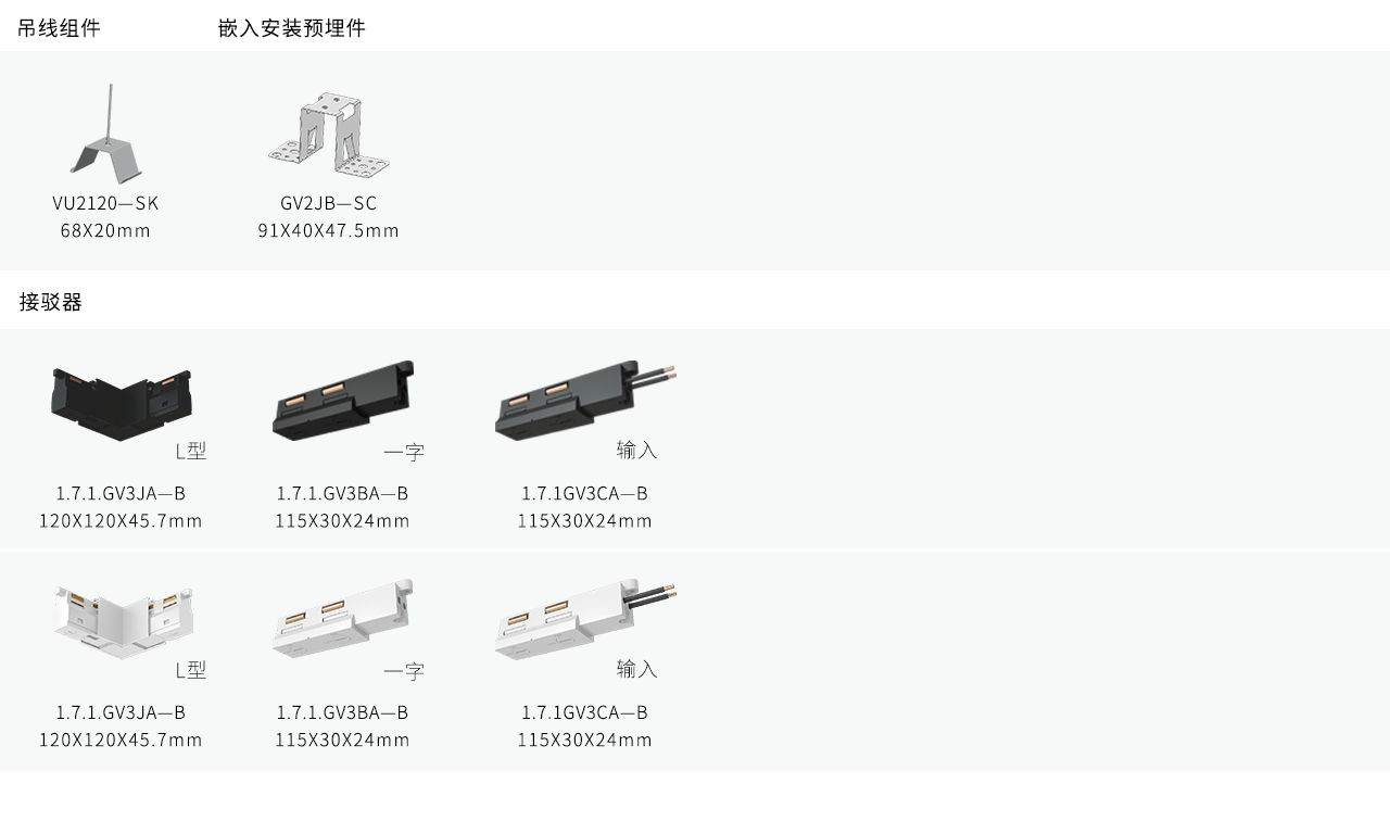 配件(附加) (ACCESSORIES):吊线组件、嵌入安装预埋组件、接驳器