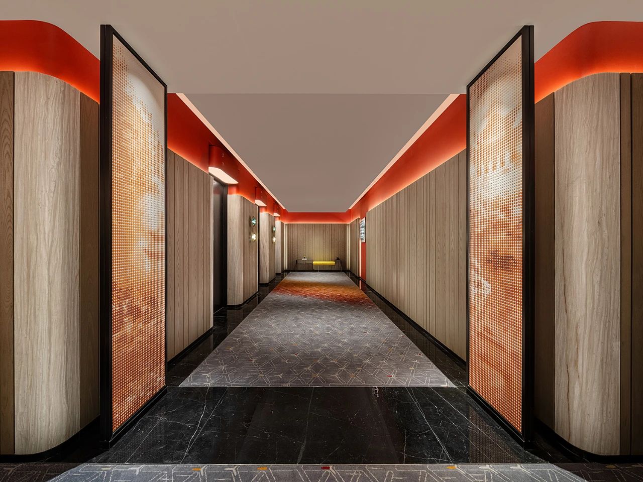 电梯厅与客房走道,以枫叶的色调与形状来进行点缀。而客房则注重现代酒店的舒心体验,以轻快简约的线条,勾勒出时尚灵感的氛围。