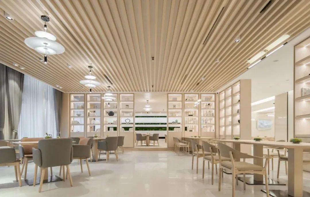 天花上均匀布置的装饰灯,如同湖面的波光粼粼,让空间变得十分灵动,灯光与宴会厅环境融为一体,满足基础照明与装饰照明,带来简洁、舒适的视觉体验。