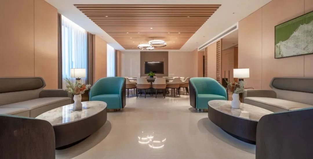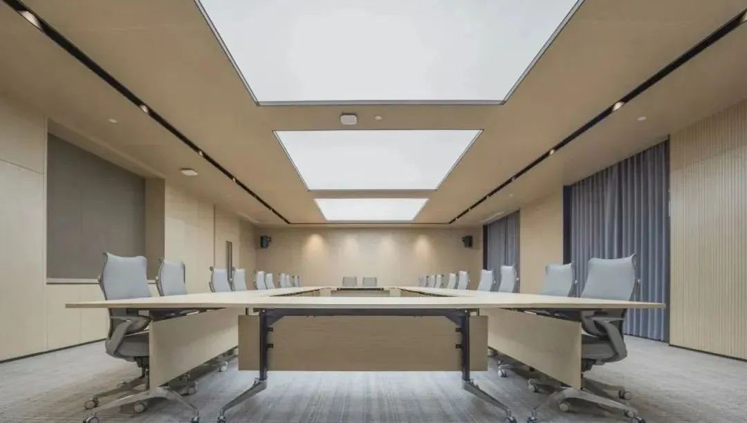 会议厅的设计简约,没有过多复杂繁琐的装饰,筒灯嵌于天花之中,深藏防眩设计营造明亮的会议光环境,灯光将干净的空间塑造得更加立体,主次分明,以简约而不简单的设计时刻提醒着你身处在这样一个雅致的地方。