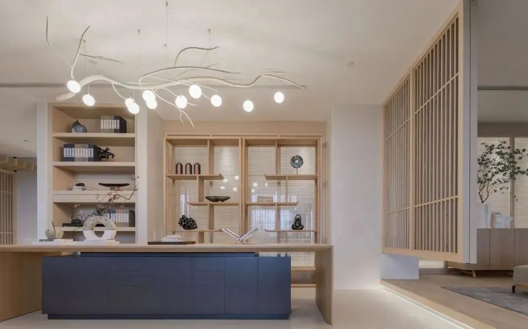 在灯光设计上,追求极致的简约,暗藏在天花凹槽处、隔板、台阶处的灯带提升了空间的氛围感,射灯为装饰物提供重点照明,让空间尽显层次,无形中制造一个优雅而静谧的空间,是顾客品茶、社交的理想之地。