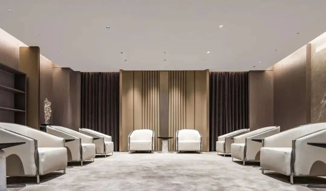 接待厅设计整体浑厚高雅,空间每个元素都承载着优雅而正统的定位,暗藏在天花凹槽处增加空间的层次感,简单柔和的线条灯光,结合古雅贵气的色调,为宾客呈现一片静谧天地。