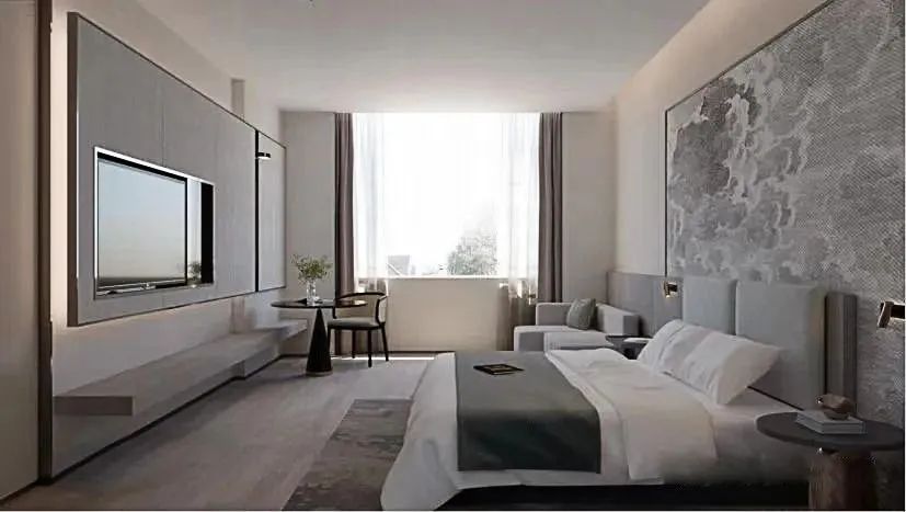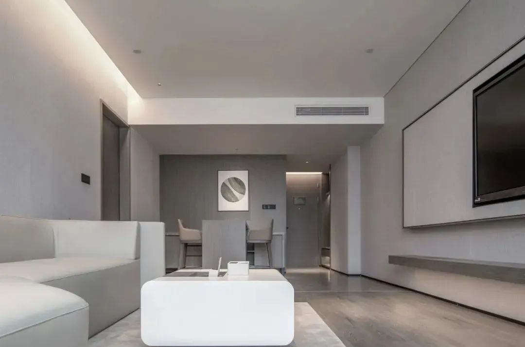 客房给宾客营造出居家之感,房内的灯光柔和温暖,采用无主灯形式,减少直接光源,天花上嵌入射灯的灯光倾洒在床头、茶几、沙发上,配合着夹层的灯带,灯效层次感突出,让宾客仿佛置身家中,慵懒又舒适。