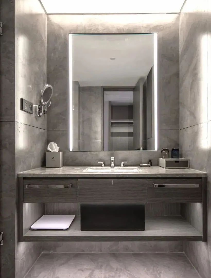 卫生间在配色上选用灰色石纹的瓷砖,台盆与瓷砖颜色、纹路保持一致,干净又柔和,无形间扩大了卫生间的视觉面积。在洗手台、马桶等顶位各安装了防眩天花灯,使每一处关键部位都能安心使用,凹槽处暗藏的灯带在照明之余能起到装饰空间的作用。