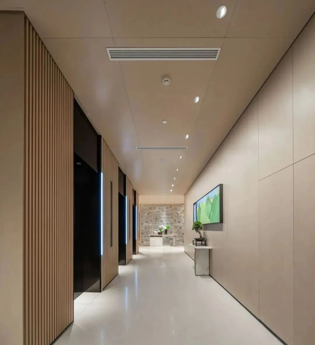 为了保持酒店风格的统一性和完整性,电梯走道选择了Geosheen极成的洗墙灯均匀布光,光束投向墙面,视觉效果柔和均匀,可以对整个走廊进行整体的照明,满足功能性的需求。
