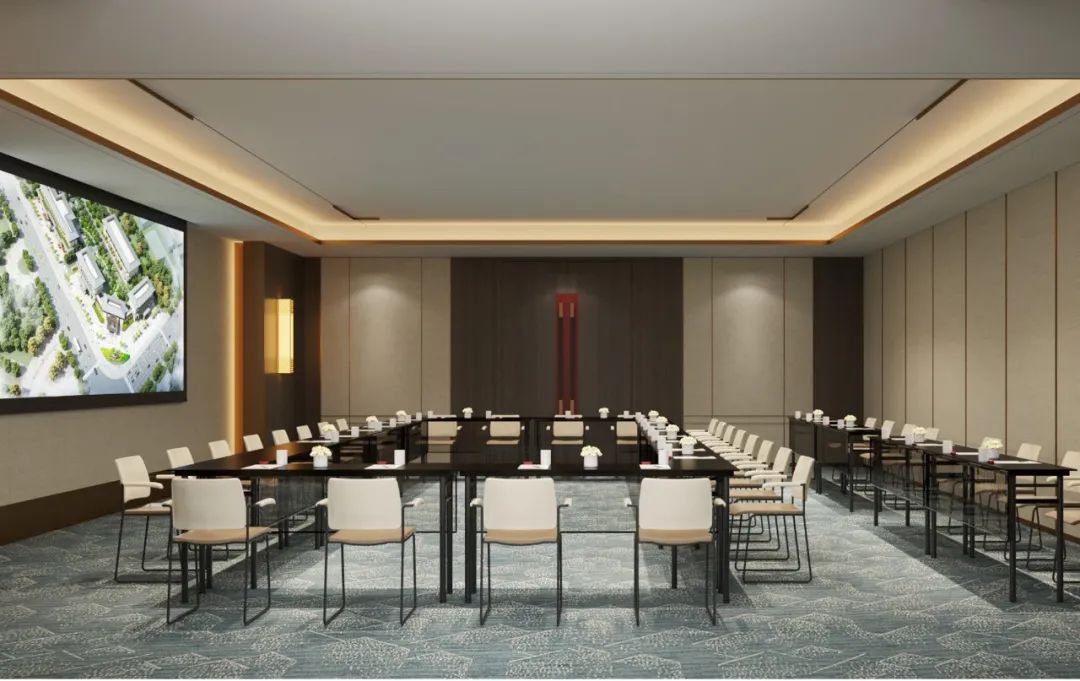 为突出天花的线条整体感,在天花凹槽内暗藏的灯光照明突出空间的层次感,同时作为基础照明为会议室提供了足够均匀的亮度。