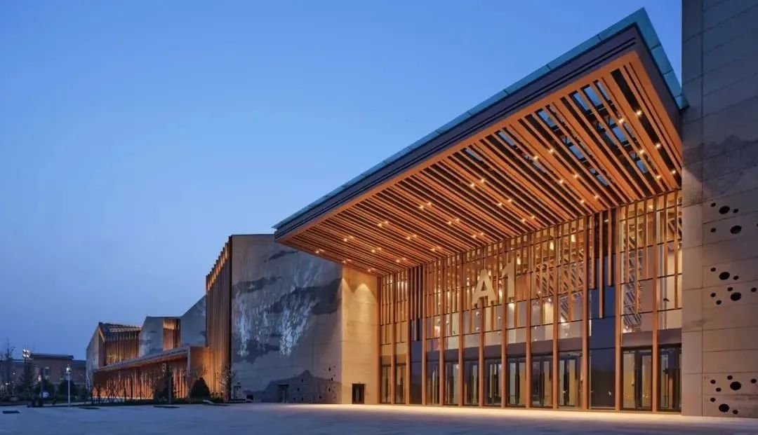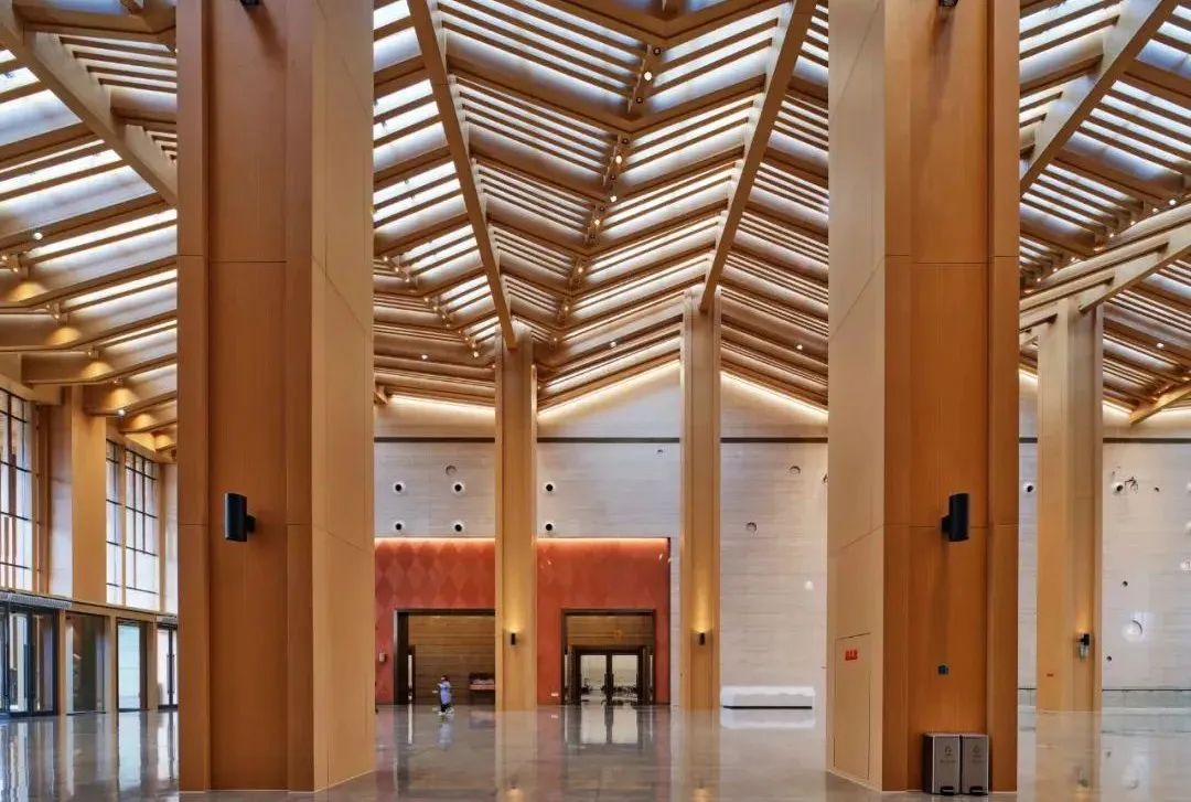大厅采用木纹转印工艺仿木纹理隔栅,立面元素体现桃林意向特征,从上宅文化中提炼的陶土、纹样,作为设计要素运用到墙体机理,地面纹样、扶手造型等方面,近观时可感受其精巧匠造之美,格栅把光切割成琴弦一般,光影斑驳,整体空间光环境均匀舒适,用光塑造出了山水画卷的意境。