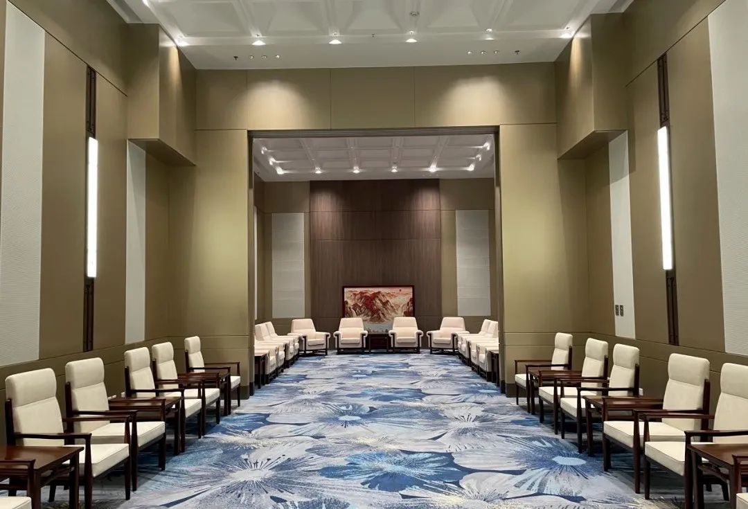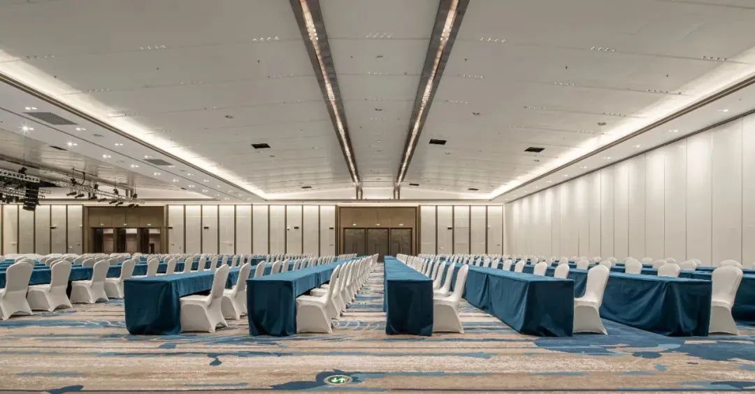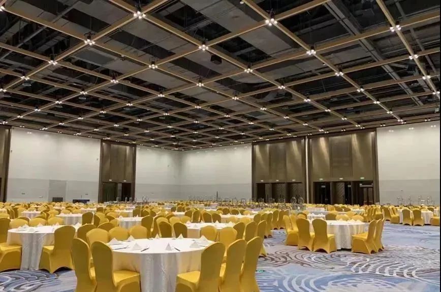 大型的多功能厅场地开阔天花板结合其整体的设计风格采用木板相交成方格形,层次清晰,高品质灯具井然有序地排布在天花上采用一般照明和局部照明相结合灯光照亮厅内每一处角落任何位置都是C位视角,即使百人会议每处都一览无遗。