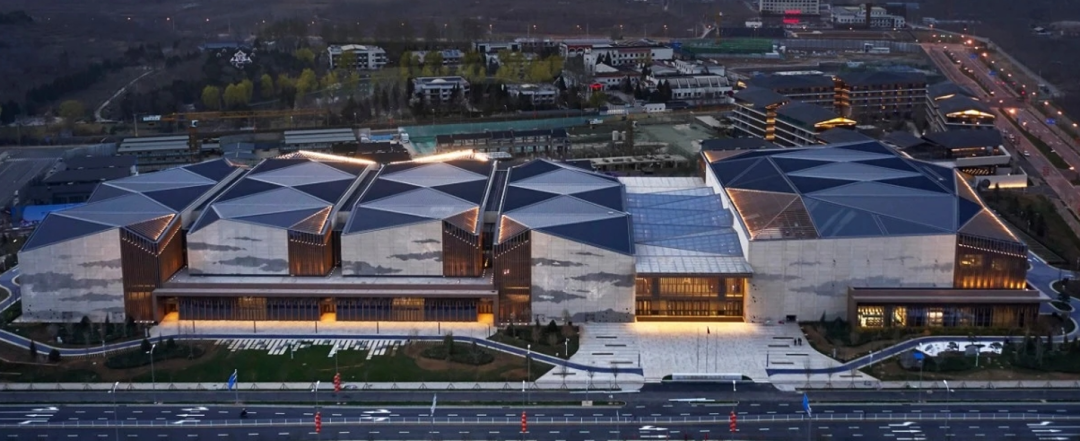 金海湖国际会展中心以平谷区特有的自然风貌“山”“谷”地貌特征为灵感,将其进行抽象处理形成具有地域特色的建筑语言,设计上通过对建筑形体的切割,形成变化丰富的建筑形态起伏的建筑形体,与远山相融合弱化建筑体量,融入整体环境。