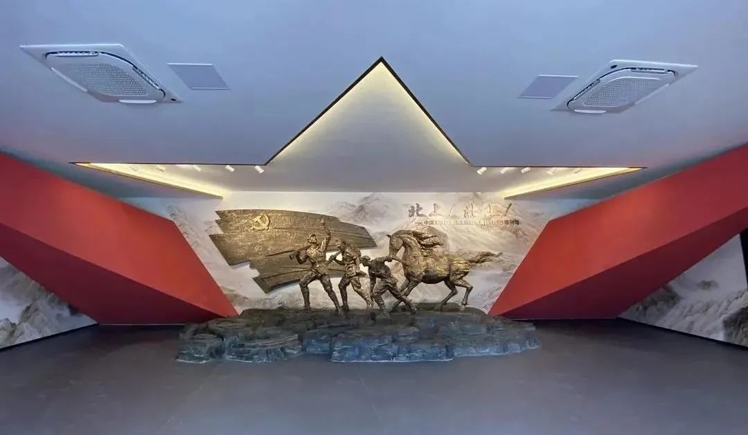 步入序厅,映入眼帘的“北上!北上!”主题雕塑,塑造了不屈不挠、英勇无畏的英雄战士形象,选用Geosheen极成防眩轨道灯对雕像做重点照明,明暗对比,灯带做辅助,起到了很好的装饰效果,点亮红军的整体精神气魄。
