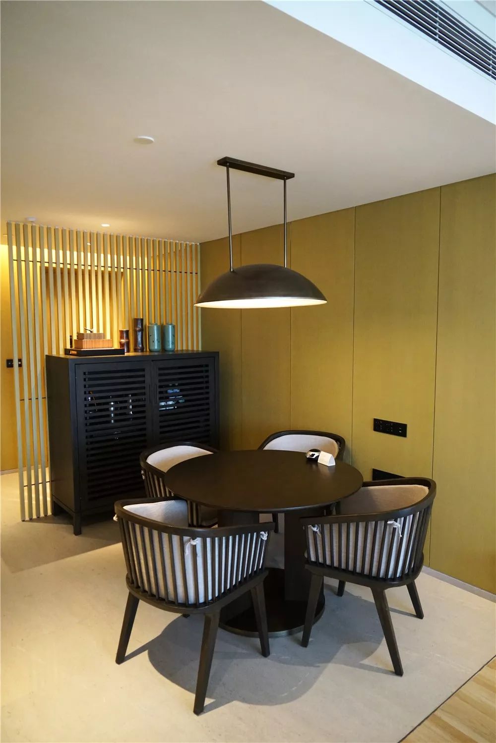 餐台照明使用嵌入式射灯做局部照明,形成视觉焦点——重点照亮餐台上放置的食物,突出食物存在感,烘托就餐的氛围和观感。