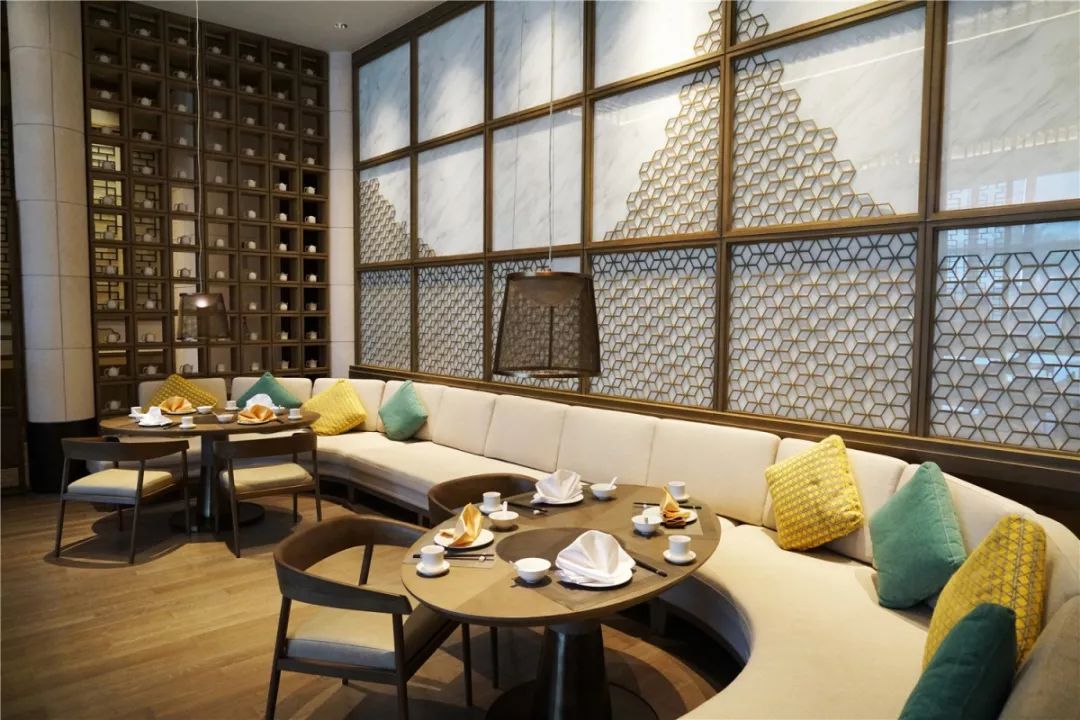 大堂吧“醇”提供各式点心和饮品,是适合商务和娱乐的理想会面场所。在设计上,大堂吧侧重使用氛围照明的方式,如墙面几何装饰照明、桌面氛围灯等方式,以塑造大堂吧轻松有格调的环境。