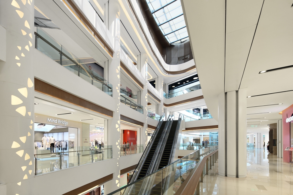 日光透过中庭上空照亮商场内部,