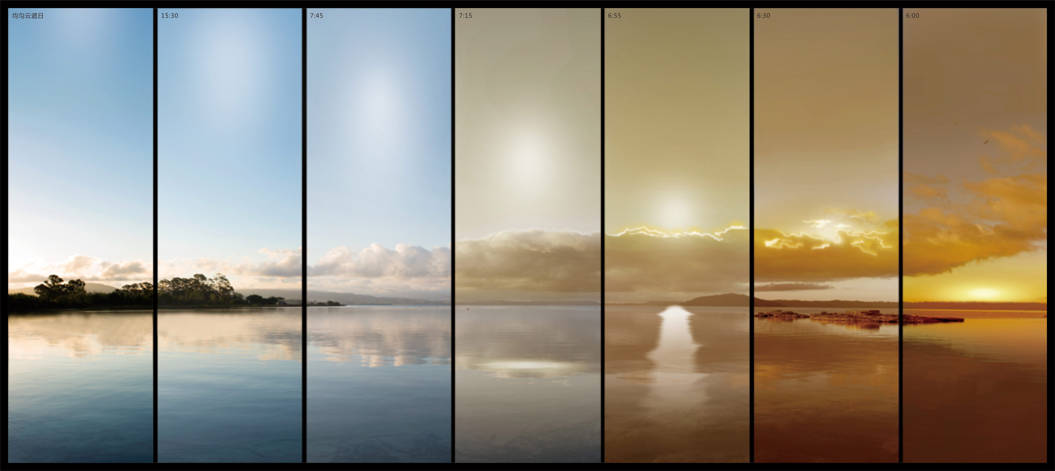一天的日光色温变化,从左至右分别是均匀云遮日、15:30、7:45、7:15、6:55、6:30、6:00。(图片来源:Geosheen极成案例)